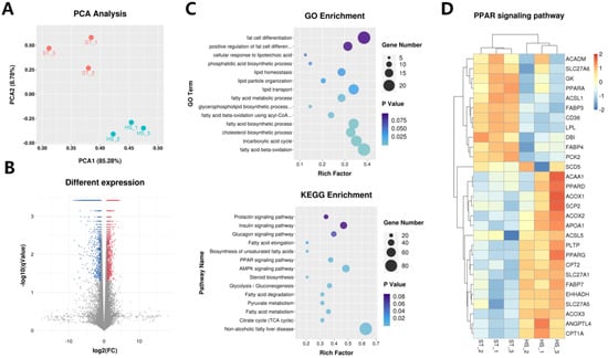 Transcriptome analysis of the mammary gland of dairy cows under heat stress. (A) principal component analysis of the whole transcripts in the mammary gland of dairy cows under heat stress; (B) volcano plot, showing significantly differentially expressed genes; (C) GO and KEGG analysis of differentially expressed genes; (D) heatmap, displaying the lactation-related gene identified in PPAR signaling pathway. ST, the appropriate temperature group; HS, heat stress group.