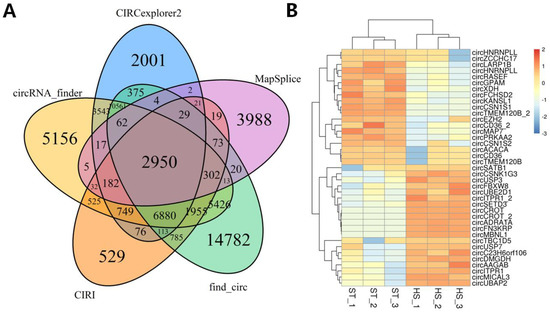 CircRNAome analysis of the mammary gland of dairy cows under heat stress. (A) Common circRNA candidates identified by all five approaches; (B) Heatmap, showing significantly differentially expressed circRNA candidates. ST, the appropriate temperature group; HS, heat stress group.