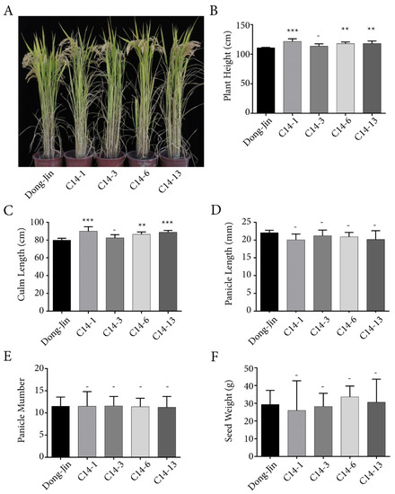 Transgenic plants were grown on ½ MS medium containing hygromycin B (40 mg/L, DUCHEFA BIOCHEMIE B.V, Haarlem, Netherlands) for selection. After incubating for 1 week under long day conditions (16 h light/8 h dark), seedlings were transferred to pots for acclimation in a greenhouse. After 4 weeks, seedlings were planted in paddy fields during the month of May, and phenotypes were observed at regular intervals until harvest in October, as described previously [6]. Plant height, panicle length, panicle number, and seed weight were recorded for approximately 20 plants per line. Data were summarized, and average values were calculated and assembled as graphs.