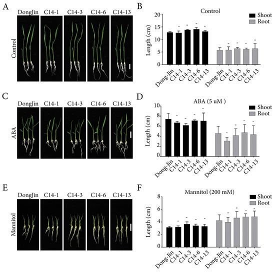 Sterilized rice seeds were plated on ½ MS medium supplemented with hygromycin for 3–4 days. Young seedlings were transferred onto ½ MS medium as the control, and ½ MS medium supplemented with 5 µM ABA (Sigma-Aldrich Corporation, St. Louis, MO, USA) or 200 mM mannitol (DUCHEFA BIOCHEMIE B.V, Haarlem, Netherlands). Plates were incubated for 5–7 days. Growth differences were recorded by measuring root and shoot length, and an average of the total measurements was calculated and presented as a graph.