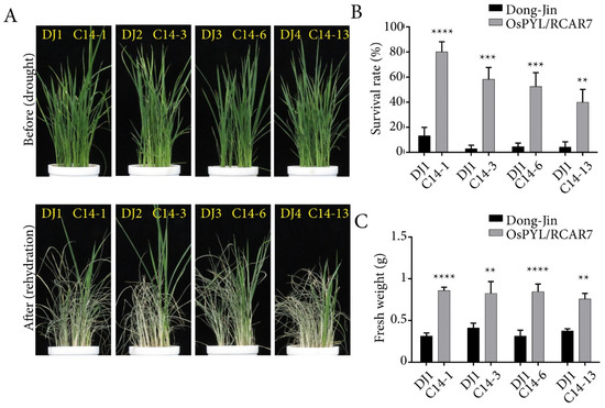 Transgenic rice over-expressing OsPYL/RCAR7 showed drought tolerance in vegetative stage. (A) Representative images of plants grown in the drought tolerance assay. All plants over-expressing OsPYL/RCAR7 (C14s) had the higher survival rate than wild type (WT) (DJs). Upper panel represents plants before drought stress treatment. Lower panel represents plants after drought stress treatment. (B) Graphical representation of survival rate after drought stress. Survival rate was calculated by counting the percentage of surviving plants in each pot. (C) Graphical representation of quantified fresh weight after drought stress. The graphs show average values with standard error (n = 6). The assay was conducted in triplicate and showed similar results. Plants were subjected to drought treatment for 7–10 days before recommencing watering. ** means p-value is less than 0.01,*** means p-value is less than 0.001 and **** means p-value is less than 0.0001.