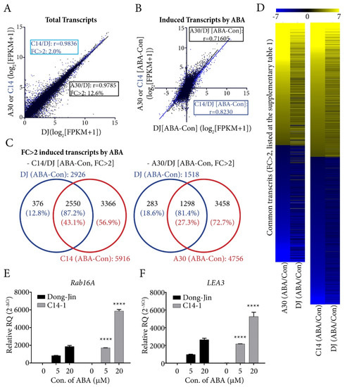 Comparative transcriptome analysis of transgenic rice overexpresing OsPYL/RCAR7 and OsPYL/RCAR3. (A) Total transcripts of C14 (transgenic plants over-expressing OsPYL/RCAR7) (blue) and A30 (transgenic plants over-expressing OsPYL/RCAR3) (black) treated with no ABA were compared with DJ (wild type). ‘r’ is pearson correlation coefficient. FC is fold change. (B) Induced or reduced transcripts in C14 (blue) or A30 (black) treated with ABA were compared. (C) Venn diagram of transcripts with more than twofold changes under ABA treatment. (D) Heat map of common trascripts (fc > 2). (E,F) Quantitative reverse transcription polymerase chain reaction (RT-qPCR) analysis with ABA dependently induced gene. Each transcript was detected in treated samples with indicated ABA treatment for 12 h. Similar expression levels were observed in triplicates. Error bars are SD. **** means that p-value is less than 0.0001. FPKM, fragment per kilo base of transcript per million mapped reads.