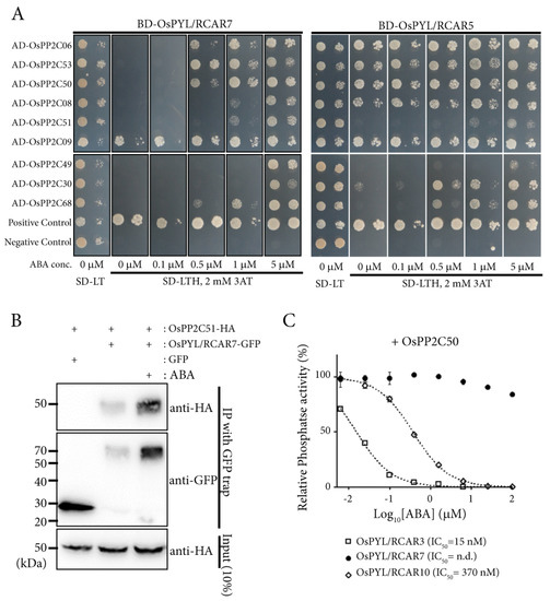 OsPYL/RCAR7 has stringent ABA dependency to interact with OsPP2CAs. (A) Yeast two hybrid analysis using OsPYL/RCAR7 and OsPYL/RCAR5 as baits and OsPP2CAs as preys. Synthetic minimal medium lacking leucine, tryptophan, and histidine (SD-LTH) supplemented with 0 to 5 μM concentration of ABA were used. Photographs were taken 5 days after inoculation of transformed yeasts. (B) OsPYL/RCAR7-GFP (green fluorescent protein) was immunoprecipiated and co-immunoprecipiated OsPP2C51 was detected by human influenza hemagglutinin (HA) antibody. (C) Inhibition assay of phosphatase activity for OsPPC50 was performed by three ABA receptors (OsPYL/RCAR3, 7, and 10).