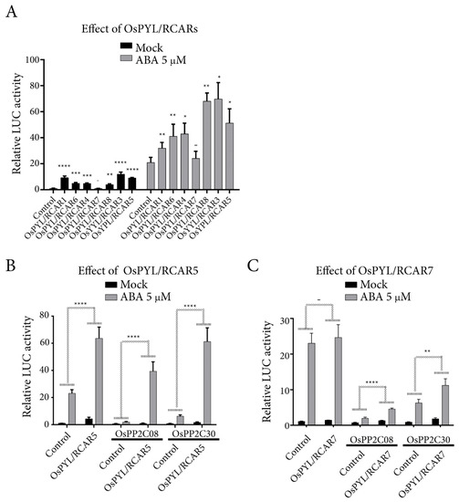Luciferase assays were conducted as described previously [30]. Complete CDSs of OsPYL/RCAR7, OsPYL/RCAR5, OsPP2C08, and OsPP2C30 were cloned into the pGEM-UbiFLAG transient expression vector, resulting in protein fusion with FLAG-tag. Constructs were transformed into protoplast cells and incubated overnight (20 h) under control (without ABA) and 5 µM ABA treatments. Samples were harvested by removing excess W5 solution, and 50 µL of passive-lysis buffer (Promega Cooperation, Madison, WI, USA) was immediately added before freezing in liquid nitrogen. Samples were vortexed, and luciferase activity was detected using a dual luciferase assay system according to the manufacturer’s protocol (Promega Cooperation, Madison, WI, USA) for 10 µL of lysed cells. pAtUBQ-rLUC (Renilla luciferase) was used as an internal control and pRab16A-fLUC promoter was used to monitor ABA signaling activity.