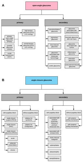 Clinical classification of open-angle glaucoma (OAG) (A) and angle-closure glaucoma (ACG) (B).
