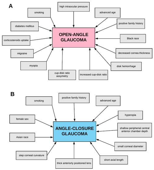 Risk factors for open-angle glaucoma (OAG) (A) and angle-closure glaucoma (ACG) (B).