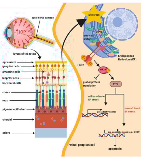 Activation of the protein kinase RNA-like endoplasmic reticulum kinase (PERK)-dependent UPR signaling pathway within retinal ganglion cells (RGCs). POAG pathogenesis, on the molecular level, is correlated with the accumulation of aberrant proteins, such as mutant myocilin, within the ER lumen, which evokes ER stress conditions within the RGCs, subsequent significant elevation of the intraocular pressure (IOP) and activation of the PERK-dependent unfolded protein response (UPR) signaling pathway. Under mild to moderate ER stress conditions, UPR has a pro-adaptive role, whereas severe or long-termed ER stress conditions trigger activation of the pro-apoptotic branch of the UPR, directly leading to RGCs’ apoptosis.