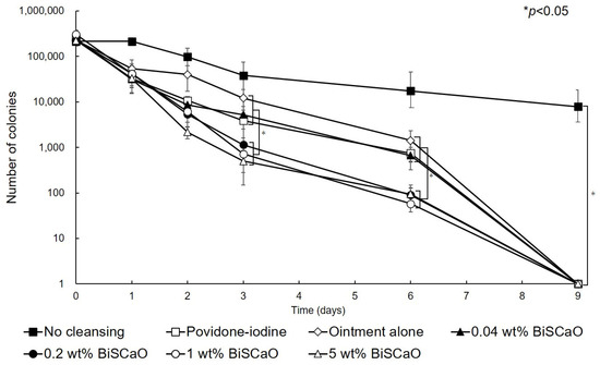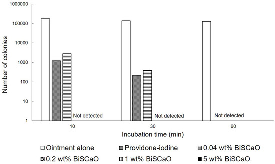 2.1. Bactericidal Activities of Various Concentrations of BiSCaO and Povidone Iodine Ointments In Vitro