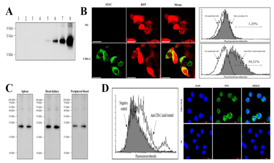 Although antibodies recognizing cell surface proteins have been successfully developed, these may exhibit different reactivities depending on the cell preparation used, e.g., fixed cell, live cell or cell lysates [13,25]. However, the anti-CD4-2 mAb (3C8) produced in this study showed a good level of responsiveness to the fixed cells used by immunofluorescence staining, the naïve form of CD4-2 expressed on the surface of the live cells used in flow cytometry, and the denatured cell lysate from the leukocytes used in Western blotting.