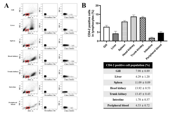 In mammals, the lymphocytes are generated in the central lymphoid organs, including the thymus and bone marrow, whereas adaptive immune responses are initiated in the peripheral lymphoid tissues comprising the lymph nodes and spleen [31]. In teleosts, thymus, head-kidney and spleen are considered as the major lymphoid tissues, functioning as sites of antigen presentation and initiation of the adaptive immune responses [32,33,34,35]. Although the thymus is one of the most important lymphoid organs in teleosts, it can no longer be observed after around seven months in olive flounder [29]. Hence, in this study, the tissue distribution of the CD4-2 T lymphocytes was examined in various tissues, including the gill, liver, spleen, head-kidney, trunk-kidney, intestine and peripheral blood, instead of the thymus. The percentages of CD4-2-positive lymphocytes were high in systemic lymphoid organs (spleen, ~11%; head-kidney, ~14%) and low in non-lymphoid tissues (liver, ~4%; intestine, ~2%; peripheral blood, ~5%). These results support previous findings showing that the spleen and head-kidney to be the major lymphoid organs related to the adaptive immune response in teleosts [31,32]. Moreover, the tissues specific for CD4-2-positive populations were consistent with those observed for other teleost species [5,9,10,22,36].
