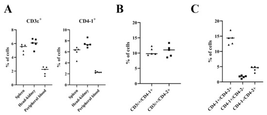 The proportion of CD3ε T cells was ~69% in humans and ~40% in salmonids [11,38], while the percentage of CD3ε T lymphocyte in head-kidney was detected at only ~6% in this study and ~3% in our previous study [14]. It was thought that the presence of the short length of the CD3ε chain in the extracellular domain in olive flounder may influence the low population of CD3ε lymphocytes, and the difference in population in the previous and current studies was due to various conditions, including fish status, the developmental stage of the fish, isolation of leukocytes, and the use of antibodies [11,14]. Nonetheless, the double labeling of lymphocytes in head-kidney using anti-CD3ε and anti-CD4 mAbs in flow cytometry showed the presence of CD3ε+/CD4-1+ cells (~10%) as well as CD3ε+/CD4-2+ cells (~11%), and this might be because CD3ε T cells containing CD4+ and CD8+ cells were detected, corresponding to previous studies for several other fish species [11,39,40,41].