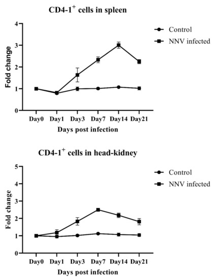 Olive flounder infected with NNV showed clinical signs of disease, such as abnormal behavior and visual dysfunction associated with central nervous system damage, while no clinical symptoms were observed in the control groups injected with PBS. Tissues from infected fish were positive for NNV coat protein RNA, detected by PCR using specific primers [20]. The percentages of both CD4-1- and CD4-2-positive lymphocytes in fish infected with NNV were found to reach a peak and then gradually decreased until the end of the experiment, while there was no changes in the control group over the course of the infection. In both spleen and head-kidney cell populations, CD4-1 lymphocytes recognized by mAb 10F8 gradually increased and peaked at 14 days post infection (dpi) in spleen and at 7 dpi in head-kidney, respectively, and then started to decrease by 21 dpi (Figure 5). In the case of CD4-2-positive lymphocytes, the levels of these cells showed a slight decrease on 1 dpi, but levels rapidly increase at 3 dpi, and reached the peak at 7 dpi compared to the control group, and then their level decreased until the end of the experiment, in both spleen and head-kidney (Figure 6).