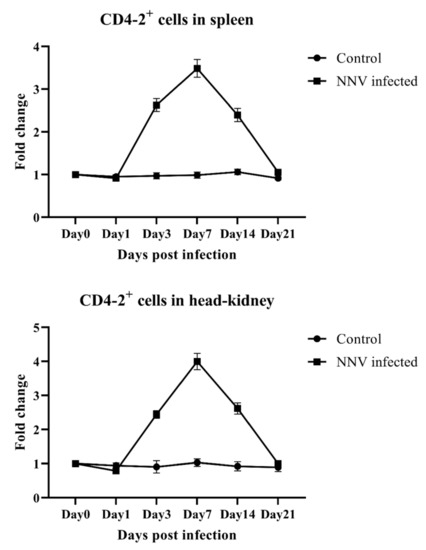 2.5. Response of CD4-1- and CD4-2-Positive Lymphocytes During an NNV Infection in Olive Flounder Determined by Flow Cytometry