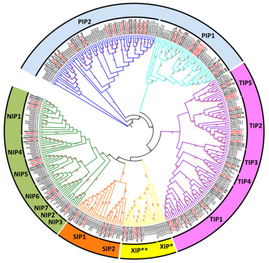 - Gupta, A.B.; Sankararamakrishnan, R. Genome-wide analysis of major intrinsic proteins in the tree plant Populus trichocarpa: Characterization of XIP subfamily of aquaporins from evolutionary perspective. BMC Plant. Biol. 2009, 20, 134. [Google Scholar] [CrossRef]