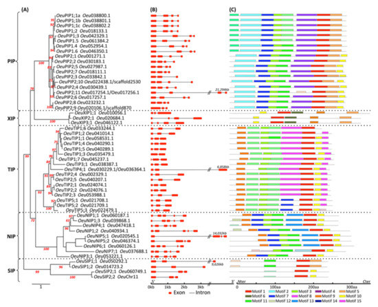 (A) Phylogenetic relationship, (B) Exon/Intron genomic structure, and (C) protein motif organization of the 52 full-length Olea europaea var. sylvestris aquaporin sequences. (A) OleuAQP Sequences were aligned with MUSCLE, and the unrooted phylogenetic tree was reconstructed using the maximum likelihood method. The numbers at the nodes represent the percentage bootstrap values (only those >50% were represented). The reliability for the internal branch was assessed using 1000 bootstrap replicates. The distance scale denotes the number of amino acid substitutions per site. OleuAQPs clustered into five AQP subfamilies: OleuPIPs, OleuXIPs, OleuTIPs, OleuNIPS and OleuSIPs. (B) Exons and introns of the OleuAQP genes are represented by red boxes and black lines, respectively. Gene structures were compared using GSDS software. Gene orientations are indicated (5′—3′) in the x-axis. (C) Distribution of the conserved motifs among the OleuAQP proteins. Motif analysis was performed by using the MEME web server. Fifteen conserved motifs were identified, and the different motifs are identified using different colored boxes, as indicated at the bottom of the figure. Each color block in the different proteins indicates a specific motif, for which the amino acids are detailed in Figure S6. Protein orientations are indicated (Nter-Cter) on the x-axis.