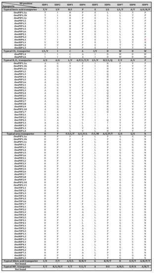 Summary of typical specificity-determining positions (SDPs) and those identified in the complete sequences of OeuAQPs from the wild olive species Olea europaea var. sylvestris. The red residue represents a putative novel site. Amino acid alignments of the OeuAQPs transporting non-aqua substrates where SDP signatures were identified are shown in Figure S8.