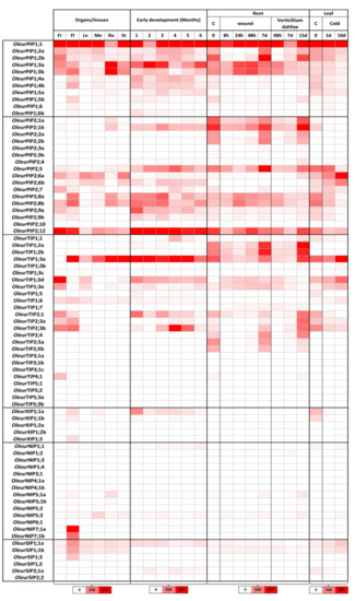 Expression profile of OleurAQP genes from the cultivated Olea europaea cv. Picual in different physiological conditions. OleurAQsP are grouped by subfamily. Fr, fruit; Fl, flower; Le, leaf; Me, meristem; Ro, root; St, stem. Control assays are marked C. h, hours post treatment; d, days post treatment. The horizontal color scales at the bottom of the figure represent the normalized expression of the aquaporins in terms of reads per kilobase of transcript per million mapped reads (RPKM). Expression levels are displayed by the depth of red, and the related values are detailed in Tables S4 and S5.