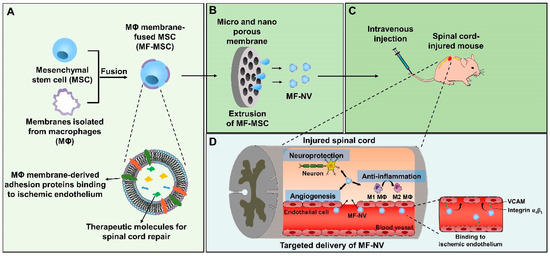 Despite the advantages of NVs and exosomes over MSCs therapies, NVs and exosomes do not have the ability to target to diseased organs after systemic injection, which limits the therapeutic efficacy of NV or exosome therapies [32,33]. To improve the diseased organ-targeting efficiency of NVs, here we fabricated macrophage membrane-fused MSCs (MF-MSCs) and then produced macrophage membrane-fused MSC-derived NVs (MF-NVs) through the extrusion of MF-MSCs (Figure 1). Macrophage membranes contain binding molecules such as very late antigen 4 (VLA4) comprising integrin α4 and β1 and the various receptors of inflammatory cytokines. The membrane proteins included in MF-NVs may facilitate the targeting of MF-NVs at the inflammatory tissues and scavenge inflammatory cytokines [34,35,36]. MF-NVs contain integrin α4 and β1 originated from macrophage membrane and may improve the efficiency of NVs targeting to ischemic and inflammatory organs such as the injured spinal cord. Here, we found that both normal MSC-derived NVs (N-NVs) and MF-NVs exhibited neuroprotective, anti-inflammatory, and angiogenic effects in vitro, which are the major therapeutic mechanisms of spinal cord repair. Following the systemic injection into mice with SCI, MF-NVs showed better spinal cord targeting efficiency and therapeutic efficacy than N-NVs.