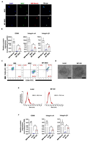Characterization of MF-MSC and MF-NV. (A) Fluorescent confocal images of MSC and MF-MSC after fusion. Scale bars, 25 μm. (B) The quantification of Western blots of surface markers of MΦ membrane (CD68, integrin α4, and β1), MSC, and MF-MSC (n = 3 per samples, 20 μg of total proteins). (C) Flow cytometric analysis of MSC (CD90) and MΦ (F4/80) surface marker expressions on MF-MSC (n = 4 per samples). (D) Transmission electron microscopy of normal MSC-derived nanovesicles (N-NV) and MF-NV. Scale bars, 50 nm. (E) Size distribution of N-NV and MF-NV, as evaluated by nanoparticle tracking analysis (n = 4 per samples). (F) The quantification of Western blots of surface marker of MΦ membrane, N-NV, and MF-NV (n = 3 per samples, 20 μg of total proteins).