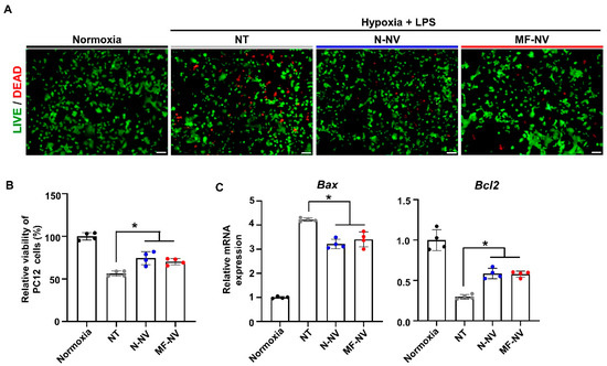 In vitro neuroprotective effects of NVs. (A) Representative images of viable and nonviable PC12 cells stained by fluorescein diacetate (FDA)/ethidium bromide (EB) after treatment. Scale bars, 100 μm. (B) Relative cell viability as evaluated by the CCK assay after the treatment (n = 4 per group). (C) Relative mRNA expression levels of apoptotic (Bax) and anti-apoptotic (Bcl2) genes in PC12 cells after treatment, as evaluated by qRT-PCR (n = 4 per group). NT indicates no treatment. * p < 0.05 by using one-way ANOVA followed by post-hoc Bonferroni test. All values are mean ± SD.