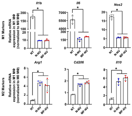 In vitro anti-inflammatory effects of NVs. Macrophage polarization after treatment. Relative mRNA expression levels in M1 MΦ of the markers of inflammatory M1 macrophages (Il1b, Il6, and Nos2) and reparative M2 macrophages (Arg1, Cd206, and Il10), as evaluated by qRT-PCR (n = 4 per group). All data were normalized to those of M0 MΦ. NT indicates no treatment. *p < 0.05 by using one-way ANOVA followed by post-hoc Bonferroni test. All values are mean ± SD.