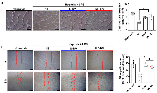 In vitro angiogenic effects of NVs. Representative images and the quantification data of (A) capillary tube formation and (B) cell migration of human umbilical vascular endothelial cells (HUVECs) after treatment. Red lines indicate borders of the cell-free area. Scale bars, 100 and 500 μm, respectively. NT indicates no treatment. * p < 0.05 by using one-way ANOVA followed by post-hoc Bonferroni test. All values are mean ± SD.