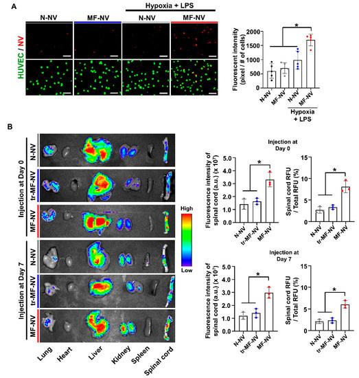 In vitro and in vivo enhanced targeting efficiency of MF-NV. (A) Fluorescent images and the quantification data of NV binding to HUVECs in vitro (n = 5 per group). Scale bars, 100 μm. * p < 0.05 by using one-way ANOVA followed by post-hoc Bonferroni test. (B) Biodistribution of N-NVs, MF-NVs, and tr-MF-NVs in injured spinal cord 24 h after injection 1 h and 7 days post-injury (n = 3 animals per group). Fluorescently labeled NVs were intravenously injected 1 h and 7 days after injury. * p < 0.05 by using one-way ANOVA followed by post-hoc Bonferroni test. All values are mean ± SD.