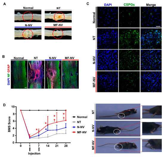 Reduced glial scar formation and improved function recovery by MF-NVs in SCI mice. (A) Representative images of spinal cord retrieved 28 days after the NV injection. The dotted red circles indicate the lesion core. (B) Representative images of immunohistochemical staining for neuron (NF, green) and astrogliosis (glial fibrillary acidic protein (GFAP), red) in longitudinal sections of spinal cord 28 days post-injury (n = 4 animals per group). Scale bars, 200 μm. (C) Representative images of immunohistochemical staining for glial scar-related component (CSPGs, green) at the lesion core 28 days post-injury (n = 4 animals per group). Scale bars, 20 μm. (D) Basso mouse scale (BMS) score-based quantitative analysis of time-lapse functional recovery in spinal cord-injured mice and the representative images of injured animals 28 days post-injury (n = 8 animals per group). The white circles indicate the ankle movement. * p < 0.05 versus NT and † p < 0.05 versus N-NV by using two-way ANOVA followed by post-hoc Bonferroni test. All values are mean ± SD. NT indicates no treatment.