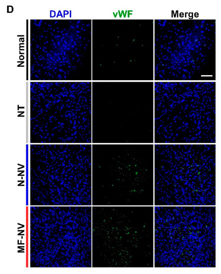 Endothelial cells and blood vessels at the injury site in the spinal cord showed degenerative changes within few hours after injury [55]. Significant decreases in the number of vascular endothelial cells were observed subsequently and might cause necrotic or apoptotic cell death. Therefore, we examined whether MF-NV injection could promote angiogenesis after SCI. MF-NV was administrated 1 h and 7 days after SCI by injection. Next, IHC staining for von Willebrand factor (vWF) of the injured spinal cord was performed 28 days post-injury (Figure 8D) (n = 4 mice per group). Surprisingly, the injection of MF-NV significantly increased vWF in the injured spinal cord, whereas the N-NV group did not (Figure 8D and Figure S10C). These data indicate that MF-NVs can enhance neuroprotection and angiogenesis, and attenuate inflammation in SCI mice model, which is attributed to the high targeting efficiency of injected MF-NVs.