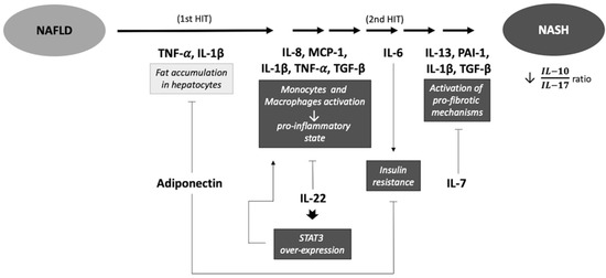 Pro- and anti-inflammatory cytokines involved in the physiopathology of NAFLD progression. IL-1β promotes fat accumulation in hepatocytes and then, it induces liver inflammation and stimulates liver fibrosis in a late stage of the disease [21,31]; TGF-β performs the same function [29]. TNF-α mediates the early stage of NAFLD by fat accumulation in hepatocytes and also facilitates disease progression to a more advanced stage. IL-8 and MCP-1 activate monocytes and macrophages and attract polymorphonuclear leukocytes to the site of inflammation inducing a proinflammatory microenvironment [22,32]. IL-6 induces insulin resistance in hepatocytes [23]. IL-13 appears to activate distinct profibrotic mechanisms during the progression of NAFLD [24]. PAI-1 is a primary regulator of the fibrinolytic system in NASH [25]. A more accentuated proinflammatory stage in NASH patients is indicated by a decrease of the IL-10/IL-17 ratio [26]. IL-7 is known to suppress expression of several molecules known to promote fibrosis and stimulates the expression of factors that protect against it [27]. Adiponectin regulates hepatic insulin resistance and is related to hepatic fat content [22,33]. IL-22 has a dual role in hepatic inflammation; this cytokine has a protective effect against liver damage inducing hepatocyte repair, but it also has a proinflammatory and tumorigenic role in the liver because of the overexpression of STAT-3 induced by a successive induction of IL-22 [28,34]. NAFLD, nonalcoholic fatty liver disease; NASH, nonalcoholic steatohepatitis; IL-1β, interleukin-1β; TNF-α, tumor necrosis factor-α; IL-8, interleukin-8; MCP-1, monocyte chemoattractant protein-1; IL-6, interleukin-6; IL-13, interleukin-13; PAI-1, plasminogen activator inhibitor-1; IL-10, interleukin; IL-17, interleukin-17; IL-7, interleukin-7; IL-22, interleukin-22; TGF-β, transforming growth factor beta; STAT-3, signal transducer and activation of transcription-3.