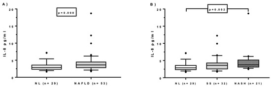 Circulating levels of IL-8 in women with morbid obesity with normal liver and with nonalcoholic fatty liver disease (A), and women with morbid obesity according to liver damage (B). NAFLD, women with morbid obesity (MO) with nonalcoholic fatty liver disease; NL, women with MO with normal liver; SS, women with MO with simple steatosis; NASH, women with MO with steatohepatitis. p < 0.05 is considered statistically significant.