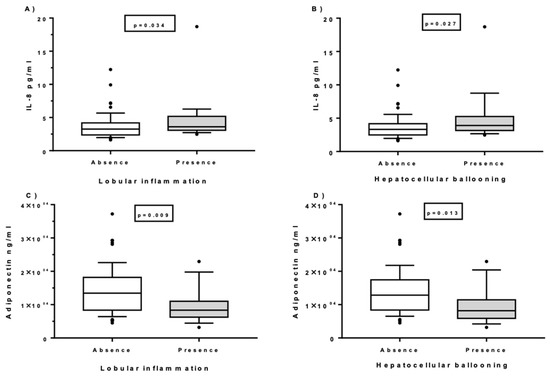 Circulating levels of IL-8 and adiponectin in women with MO according to the presence or absence of lobular inflammation (A,C) and hepatocellular ballooning (B,D). Data are expressed as medians (10–90th). p < 0.05 is considered statistically significant.
