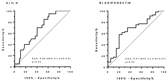 As a final step, we evaluated the diagnostic efficacy of circulating IL-8 and adiponectin levels as markers of NASH in a group of patients with liver histology indicative of NASH. A cut-off point and area under the curve were determined so that NASH could be diagnosed. To evaluate the extent to which these cytokines can predict histological features, a receiver operating characteristic (ROC) curve was obtained. The accuracy with which this panel discriminates NASH subjects from non-NASH subjects in the case of IL-8 showed an area under the ROC curve (AUROC) of approximately 0.68 (Figure 4A). On the contrary, plasma adiponectin levels were predictors of no NASH, with an AUROC of 0.67 (Figure 4B).