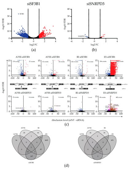 Transcriptomic changes upon silencing SNRPD3 compared to silencing SF3B1. (a) Differential expression (DE) analysis revealed 729 upregulated and 1260 downregulated genes when SF3B1 was silenced in A549 non-small cell lung cancer (NSCLC) cells (FDR < 0.05, logFC < −1 or > 1). (b) In contrast to siSF3B1, only eight and six genes were up- or downregulated upon SNRPD3 knockdown, respectively (FDR < 0.05, logFC < −1 or > 1). (c) Alternative splicing (AS) events (A3′SS, A5′SS, RI and ES) upon silencing SF3B1 (top) or SNRPD3 (bottom). Silencing SF3B1 led to considerably more AS events than silencing SNRPD3. (d) Venn diagrams showing the overlap between the types of AS events within samples. Upon SF3B1 silencing, multiple AS events occurred within the same gene, whereas SNRPD3 silencing led to mostly single AS events within genes.