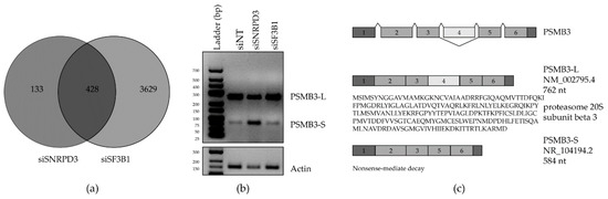 The following are available online at https://www.mdpi.com/1422-0067/21/12/4192/s1, Figure S1: Workflow of the RNA sequencing experiment, Figure S2: Histograms depicting the frequency distribution of inclusion and skipping counts calculated by rMATS, Figure S3: PCR or quantitative PCR was performed to validate siSNRPD3-specific AS events predicted by rMATS, Figure S4: Analysis of PSMB3 expression, Figure S5: Analysis of publicly available NSCLC expression dataset, Table S1: DE_siSF3B1, Table S2: DE_siSNRPD3, Table S3: AS_siSNRPD3, Table S4: AS_siSF3B1, Table S5: AS_overlap, Table S6: Primer sequences, Table S7: siRNA sequences.