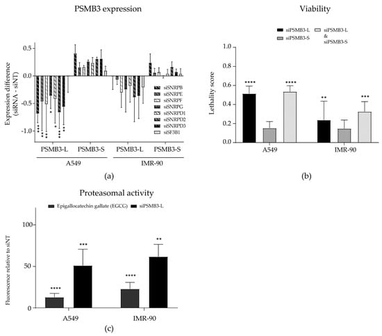 We next investigated if the AS switch in PSMB3 compromised cell viability and could thus explain the cancer cell-selective cytotoxicity of Sm gene silencing. To this end, custom siRNAs were designed to specifically target either the PSMB3-L or PSMB3-S variant. The silencing of each PSMB3 variant was confirmed by PCR (Figure S4B). Silencing PSMB3-L induced a slight increase in PSMB3-S expression. Therefore, siRNAs silencing PSMB3-L and PSMB3-S were also combined, to discriminate between the effects caused by the loss of PSMB3-L and the gain of PSMB3-S. Interestingly, silencing PSMB3-L, but not PSMB3-S, resulted in decreased cell viability in both A549 NSCLC cells and IMR-90 fibroblasts (Figure 3b). When co-transfecting cells with both siRNAs, viability was decreased to a similar extent as observed when silencing PSMB3-L alone (Figure 3b). This indicates that the loss of PSMB3-L, and not the increase of PSMB3-S, accounts for the observed cytotoxicity. To investigate if this cytotoxicity could be related to a function of PSMB3 in protein catabolic processes, the proteasomal cleavage of N-Succinyl-Leu-Leu-Val-Tyr-7-Amido-4-Methylcoumarin (Suc-LLVY-AMC) was measured upon silencing PSMB3-L in A549 NSCLC cells (Figure 3c). The proteasome inhibitor epigallocatechin gallate (EGCG) was included as a positive control. PSMB3-L silencing was confirmed with PCR (Figure S4C). Silencing PSMB3-L significantly decreased proteasomal activity, although not as effectively as the proteasome inhibitor, suggesting that the loss of proteasomal activity via the decreased expression of PSMB3-L could contribute to the cytotoxic effect of Sm gene silencing.