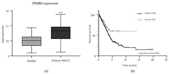 Analysis of publicly available data on PSMB3 expression in clinical materials. (a). PSMB3 is overexpressed in NSCLC (n = 91) compared to adjacent normal lung tissue samples (n = 65) in the NSCLC mixed non-small cell lung carcinoma dataset [14]. Error bars indicate the standard deviation. **** p < 0.0001. (b). Survival analysis of the Cancer Genome Atlas Lung Adenocarcinoma dataset [15] revealed that high PSMB3 expression corresponds to worse survival in patients with lung adenocarcinomas (log-rank p-value < 0.01; high expression n = 386; low expression n = 114).