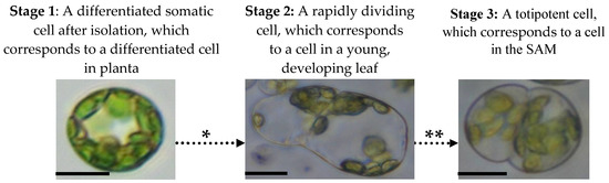 Based on the stages of cell differentiation from the SAM to the mature leaf, we can distinguish three stages in the de-differentiation of the mesophyll protoplast [79,80], which are in reverse to the differentiation stages and which include the induction of the reprogramming process, the epigenetic remodelling of the chromatin and the induction of totipotency (Figure 1).