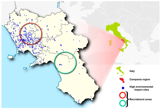 Map of the geographical areas selected for the recruitment. The red and green circles indicate the high and low environmental impact areas, respectively, in Campania region (Italy). Blue points indicate the sites of high environmental impact as recognized by the Campania Region Environmental Protection Agency report (2008).