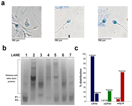 Characterization of human Sperm Nuclear Basic Proteins (SNBP) from samples belonging to the H- and L-groups. (a) Staining of spermatozoa collected from samples of H-group males. The light (left), the intermediate (middle), and dark aniline blue-stained (right) spermatozoa represent mature, moderately immature, and severely arrested maturity spermatozoa found in this group. (b) AU-PAGE of SNBP showing the CP/Hr (lane 1), only-H (lane 2–3), and not CP/Hr (lanes 4–7). (c) Percentage distribution in H-and L-groups of protamines/histones ratios found in spermatozoa. In blue, the samples containing the CP/Hr; in green, the nCP/Hr; and in red, the samples showing only-H.