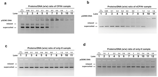 DNA-binding ability of SNBP obtained from H-group analyzed by Electrophoretic Mobility Shift Assays (EMSA) on 1% agarose gel. Bands on gel representing the state of pGEM3 plasmid DNA incubated in a ratio w/w with increasing amount of SNBP from samples containing CP/Hr (a), nCP/Hr (b), and only-H (c,d).