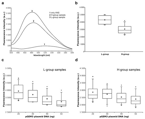 Fluorescence analyses of SNBP from samples containing CP/Hr belonging to the H- and L-groups. (a) Fluorescence spectra of ANS in the absence (curve 1) and in the presence of SNBP obtained from samples belonging to H- (curve 2) and L-groups (curve 3). (b) Box plot of fluorescence intensities of 8-anilinonaphthalene-1-sulfonic acid (ANS) in the presence of SNBP from samples belonging to H- and L-groups. Box plot of fluorescence intensities of the complexes ANS–SNBP belonging to the L-group (c) and H-group (d), in the presence of increasing pGEM3 plasmid DNA concentrations.