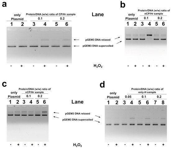Analysis on 1% agarose gel of pGEM3 plamid DNA breakage induced by H2O2. In the presence of SNBP from H-group samples showing CP/Hr (a), nCP/Hr (b,c) and only-H (d).