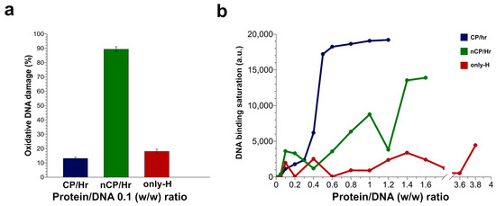Graphical representation of the effects on DNA of human sperm proteins from samples belonging to the H-group showing canonical protamines/histones ratio (CP/Hr), protamines and histones, but not in the canonical ratio (nCP/Hr), and only-H. (a) Histograms of DNA oxidative damage, at 0.1 protein/DNA w/w ratio, quantified by densitometric analysis of bands on gels in Figure 5. (b) Lines chart of the DNA binding saturation, at increasing protein/DNA ratios, calculated by densitometric analysis of supercoiled bands on the gels of Figure 3.