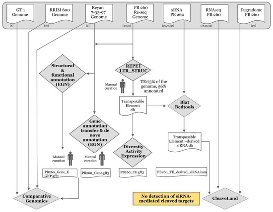 In this study, we chose PB 260 clone for which genomic [20,21], transcriptomic [17,38,39] and microtranscriptomic data [20,35,37] were available (Figure 1) [4,5,17,18,20,21,35,37,38,39]. In addition, functional validation could be possible for this clone as the genetic transformation procedure is robustly mastered [40,41,42,43,44,45]. Our objective was to annotate, in clone PB 260, TEs and siRNAs sharing sequence identity with TEs (namely TE-derived siRNAs as a track of annotation), to infer their possible interference with gene expression in laticifers, and to show TE-transcriptional regulation of genes involved in rubber biosynthesis. Firstly, we carried out in silico detection and accurate annotation on a genome scale of TEs with the REPET and LTR_STRUC pipelines [46] (Figure 2), as only a few active elements have been described in the genus Hevea so far [47]. Thus, from the Hevea TE database generated, their diversity and activity were further analysed (Figure 1). Secondly, as the majority of the REF/SRPP genes were clustered on a single scaffold 1222 [4], this genomic region was curated manually. The capacity of TEs to produce siRNAs was evaluated. Lastly, all this computational information was combined to put forward hypotheses on how genomic/epigenomic environments affect the transcriptional regulation of REF/SRPP gene cluster by comparing side-by-side genomic sequences from other clones (PB 260, Reyan 7-33-97, RRIM 600 and GT 1).