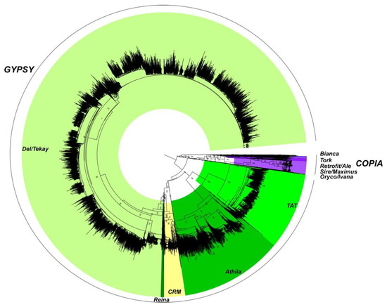 Complete and incomplete TEs were classified according to their Orders and Superfamilies, as described in [25]. In rubber, the largest Order consists of the LTR retrotransposons (RLX in Table 1). LTRs represent more than 77% of TE length in the genome sequence of clone PB 260. Far behind, the Large Retro-transposon Derivatives (RXX-LARD) Order/Superfamily represented 7%. MITE (Miniature Inverted-repeat Transposable Element, 0.13% of TE) and SINE (0.17% of TE), with less than 1700 copies each, were annotated separately with more specific pipelines, namely MUST and Sine_finder (Figure 2). Since most TEs belonged to the LTR Order, a complete phylogenetic analysis, based on amino acid sequences from the reverse transcriptase (RT) domain, when present, was carried out on 1476 full-length copies obtained after LTR_STRUC and Inpactor classification with nine major lineages of LTR retrotransposons, of which 4 and 5 belonged to the Ty1/copia and Ty3/gypsy superfamilies, respectively (Supplementary Figure S1). In addition, the representativeness of the diversity of LTRs was not affected by the manual curation step of the consensus sequences predicted with REPET, as shown by the complete phylogenetic analysis carried out before and after manual curation (Supplementary Figure S2A,B). Lastly, at genome-wide level, a significant fraction of the Hevea genome was composed of LTR Ty3/gypsy elements and more particularly the Del/Tekay groups, with more than 9129 elements (9129/11,989; 76.1% of RT domains) (Figure 3).