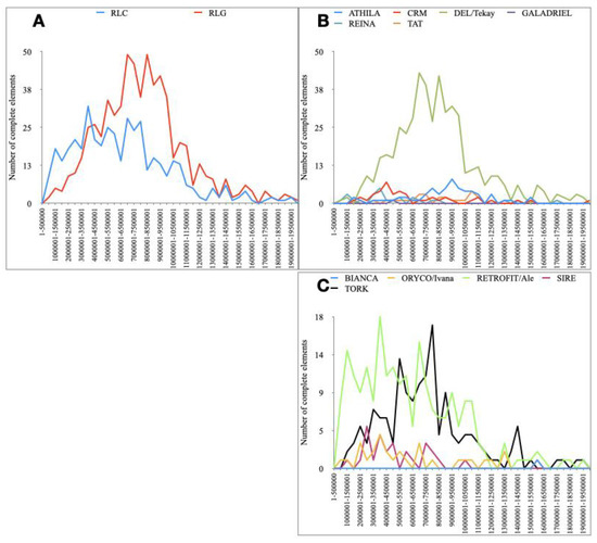 Timing of full-length LTR retrotransposon insertions into the H. brasiliensis clone PB 260 genomic sequence. (A) Blue and red lines represent, respectively, the number of Ty1/copia (RLC) and Ty3/gypsy (RLG) full-length LTR retrotransposons per bins of 0.5 Million Years (MY). (B) Coloured lines represent the number of full-length Ty3/gypsy (RLG) LTR retrotransposon lineages per bins of 0.5 MY. (C) Coloured lines represent the number of full-length Ty1/copia (RLC) LTR retrotransposon lineages per bins of 0.5 MY. Only the full-length LTR retrotransposons found by LTR_STRUC were used here. An average substitution rate of 3.89 × 10−9 was used.