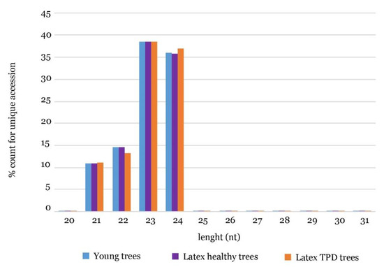 Length distribution of unique TE-derived small RNA accessions from Hevea tissues: (young trees (•), latex fromhealthy trees (•) and latex from TPD-affected trees (•)).