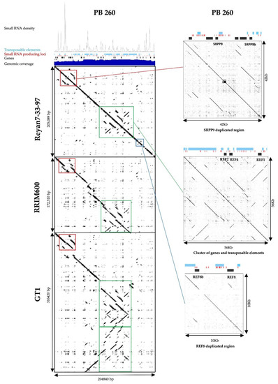 Scaffold 1222 sequence comparison between clones PB 260, Reyan 7-33-97, RRIM 600 and GT 1 by Dot-Plot and genomic DNA read abundance, gene, transposable elements and small RNA density (for PB 260 only). Genomic DNA reads are represented in dark blue, genes in black, transposable elements in light blue, and small RNA in red associated with their density profile. Regions of interest were zoomed in and displayed at the right.