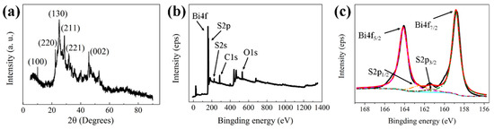 (a) XRD spectra of the graphene oxide (GO)/Bi2S3 NPs, (b) XPS survey spectra of the GO/Bi2S3 nanoparticles (NPs) and (c) the high-resolution spectra of Bi4f and S2p.